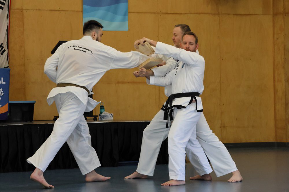 Self-Defence (Hosin Sul): Defense against an armed opponent (Dae Moogi): Defense against a Bayonet (Dae Chong Gum): Bayonet thrust to the solar plexus
