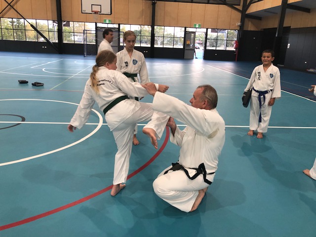 Self-Defence (Hosin Sul): Defense against an armed opponent (Dae Moogi): Defense against a Club (Dae Gonbong): Front downward strike toward the forehead